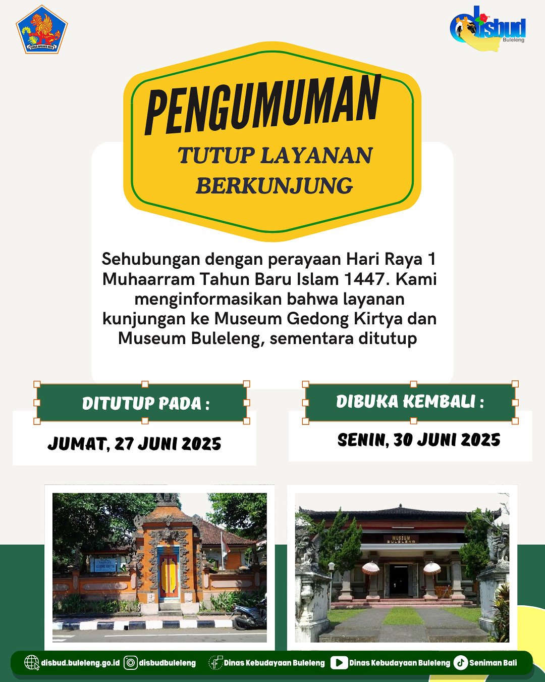 Sehubungan dengan perayaan Hari Raya 1 Muhaarram Tahun Baru Islam 1447. Kami menginformasikan bahwa layanan kunjungan ke Museum Gedong Kirtya dan Museum Buleleng, sementara ditutup