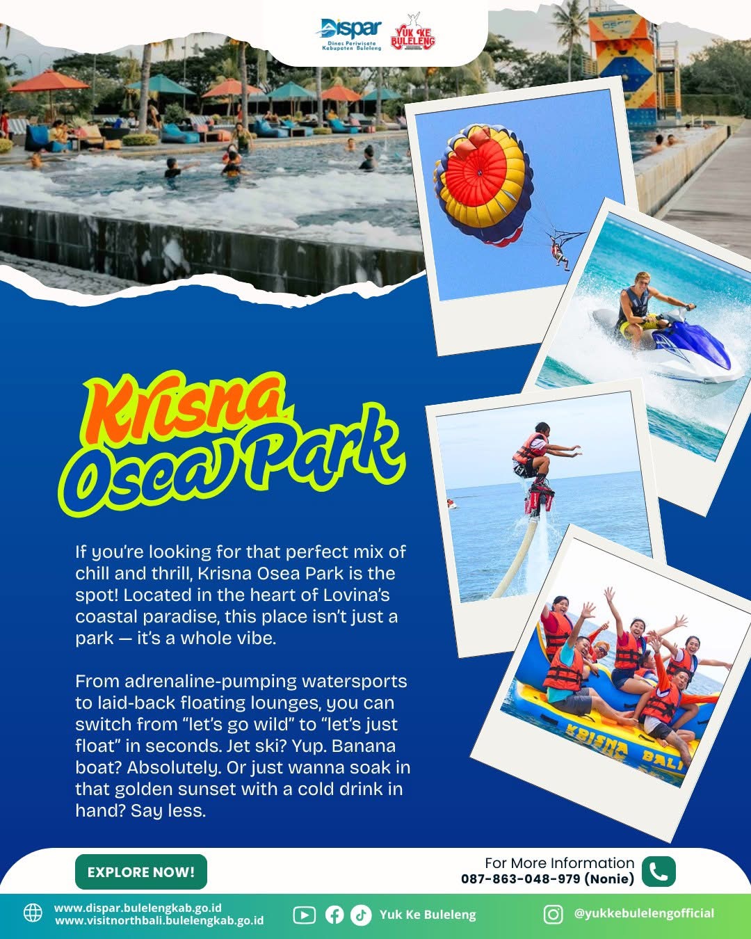Mau liburan anti boring? Langsung gas ke Krisna Osea Park, Sob! Dari pagi sampe sore, kamu bisa cobain serunya water sports – dijamin bikin adrenalin naik! Belum lagi ada Dolphin Watching, bisa lihat lumba-lumba lucu langsung dari laut, bukan dari TV! Lokasinya ada di Desa Temukus, Kecamatan Banjar, Buleleng.