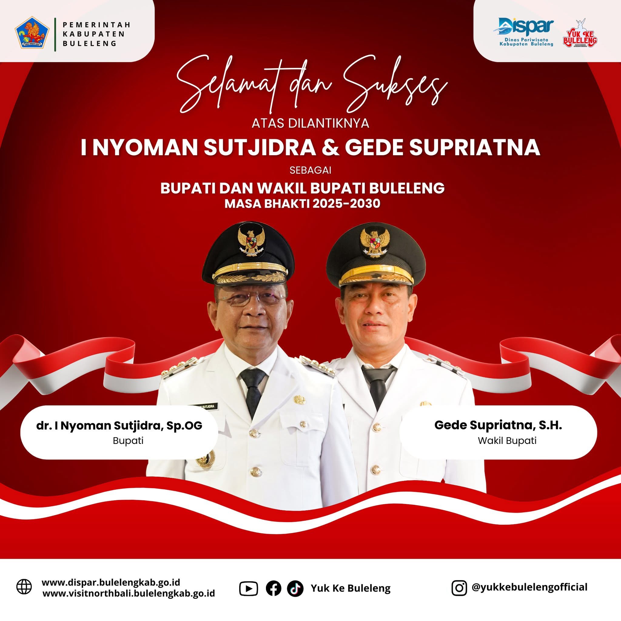Dinas Pariwisata Kabupaten Buleleng beserta jajaran dan staf mengucapkan selamat atas dilantiknya Bapak Bupati Buleleng dr. I Nyoman Sutjidra, Sp.OG. dan Wakil Bupati Buleleng Gede Supriatna, S.H. masa jabatan 2025-2030 yang akan dilaksanakan besok, pada tanggal 20 Februari 2025.