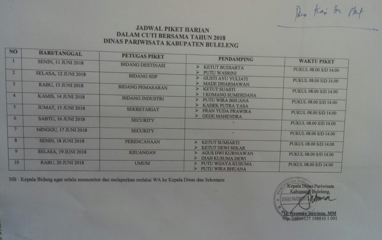 Jadwal Piket Harian Dalam Cuti Bersama Tahun 2018 DISPAR BULELENG